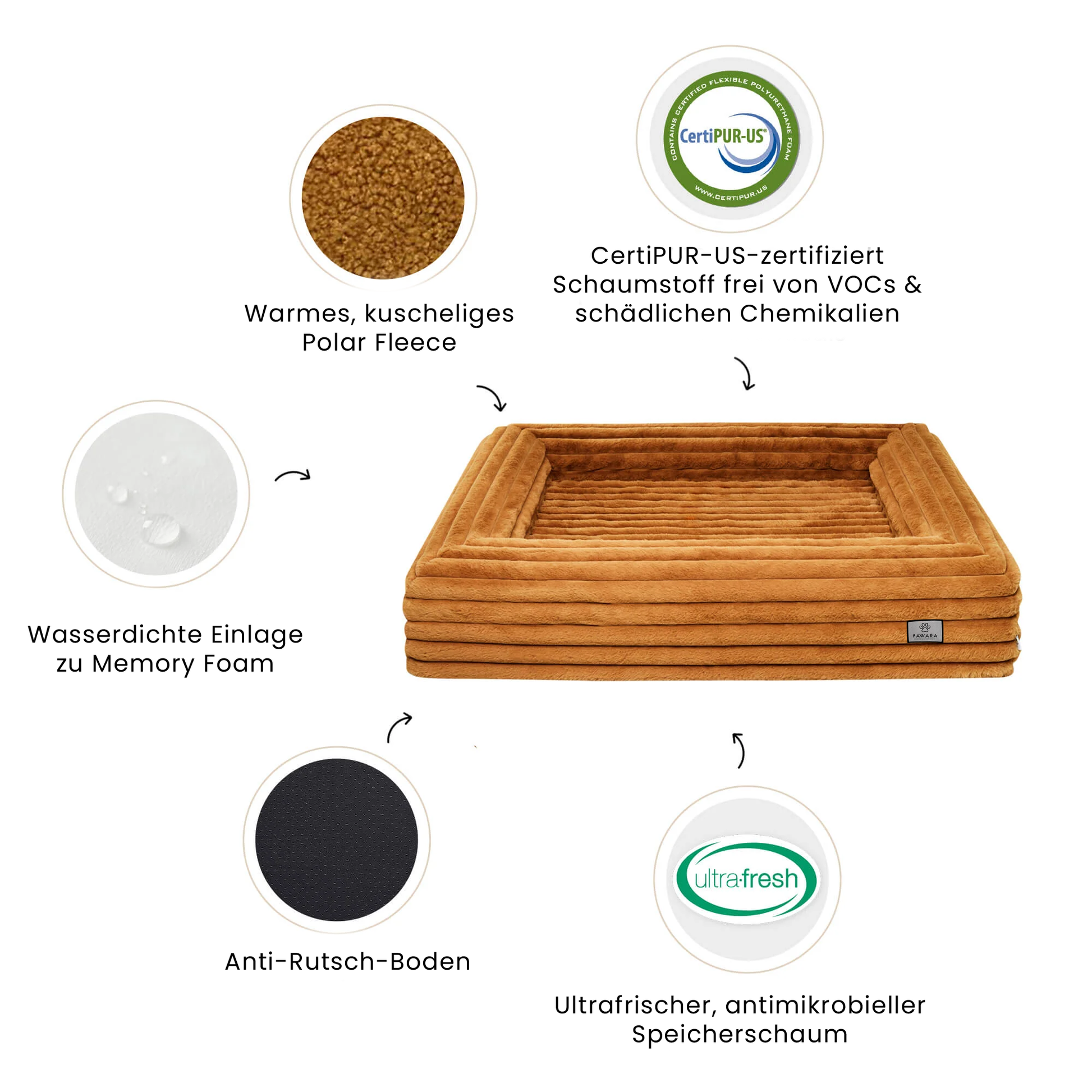 Untere Schicht: Orthopädischer Memory-Schaum für die Gelenke und Knochen deines Hundes.